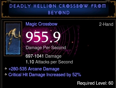 I have very cheap gear compared to other classes and what is in the auction house available. My weapon is a magic crossbow with 955,9 dps and critical hit damage increased by 52%.